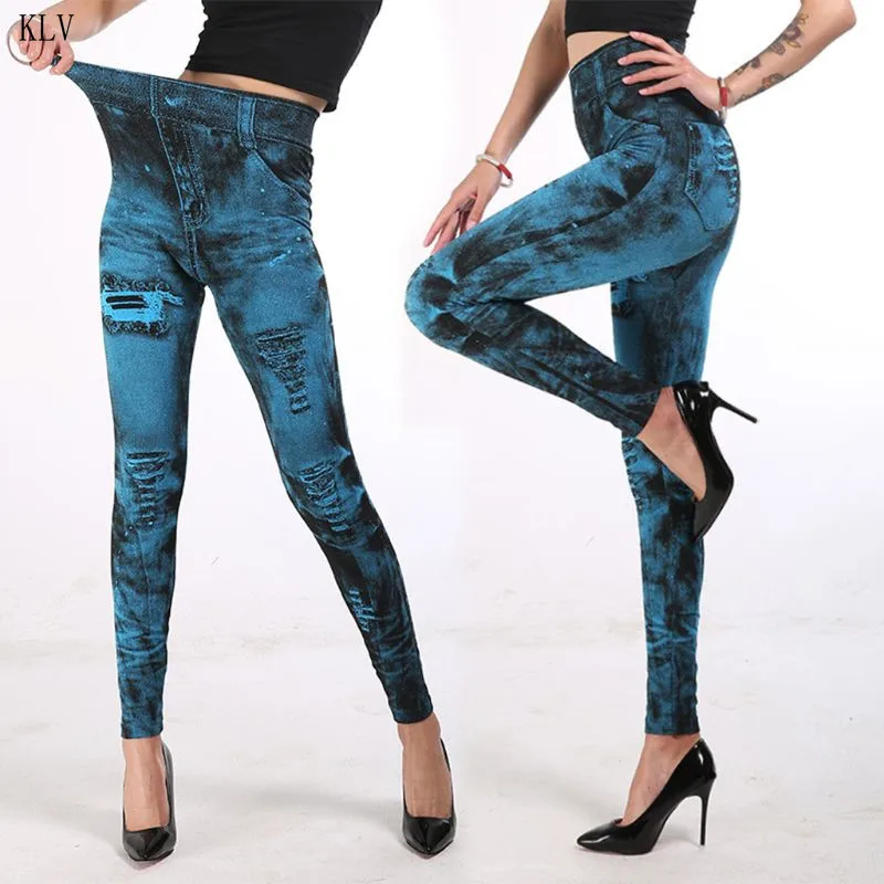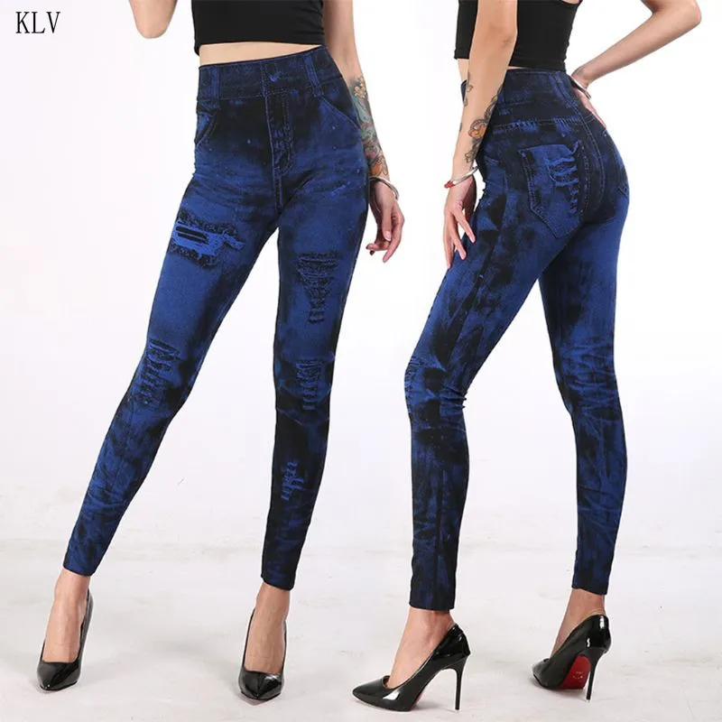astounding Women 2020 Imitation Distressed Denim Jeans Leggings Casual High Waist Slim Elastic Pencil Pants